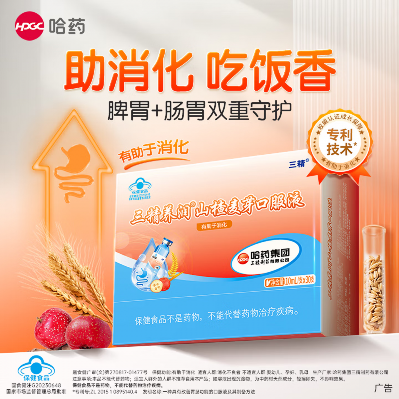 而哈药三精养润®山楂麦芽口服液,正是沿着这个调理思路研发的,特别贴合小朋友的需求。它是国家蓝帽认证的保健食品,每10ml含总黄酮2.5mg,助力消化的效果更有保障,让家长更放心。